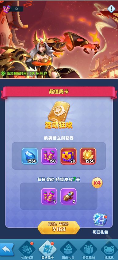 活动期间,开放国庆周卡购买,购买周卡可以获得大量奖励。