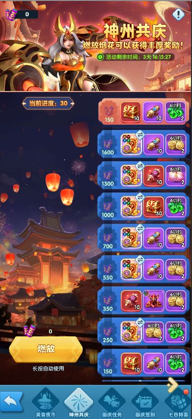 活动期间,通过燃放烟花提升进度,达到一定阶段可获得阶段奖励。
