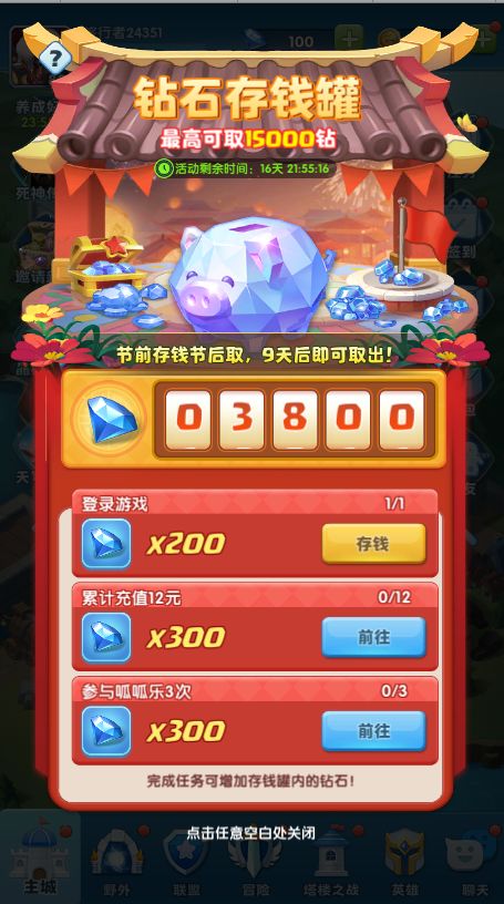 活动存钱期间,完成任务可增加存钱罐内钻石,取钱期可取出存钱罐的钻石。