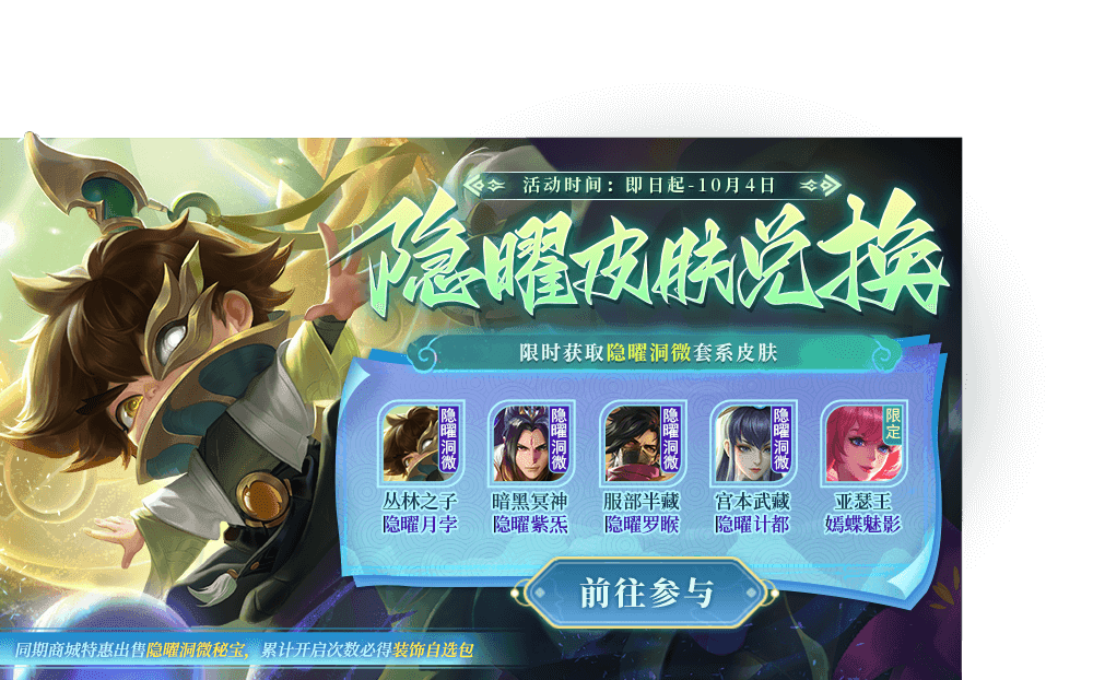 隐曜皮肤兑换开启!限时获取宫本武藏-隐曜计都、服部半藏-隐曜罗睺、暗黑冥神-隐曜紫炁、从林之子-隐曜月孛、以及限定皮肤亚瑟王-嫣蝶魅影等好礼!