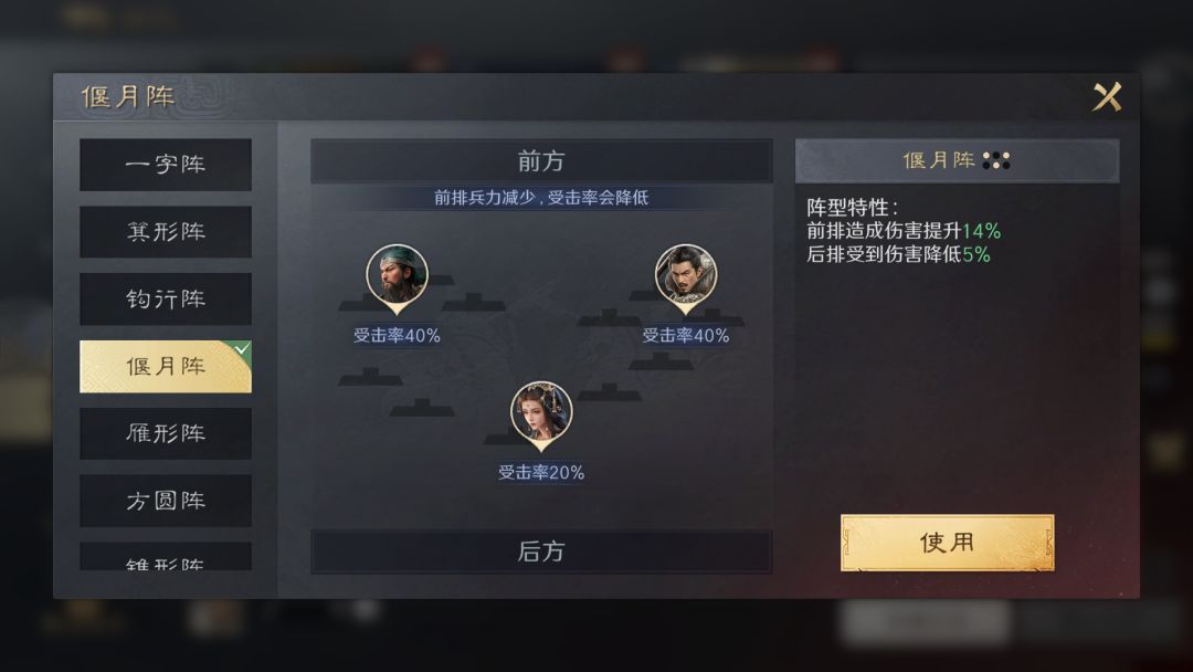 阵型特性:前排受到的伤害降低8%;后排连击率提升25%