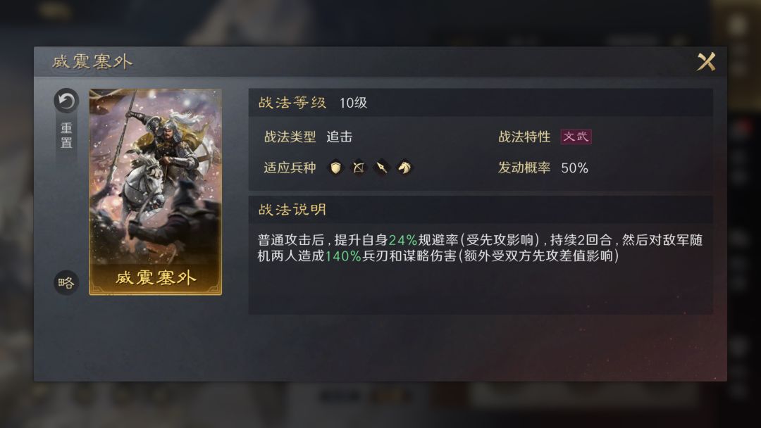 公孙瓒的自带战法【威震塞外】是打文武伤害的追击战法,配合孙权自带战法【虎踞江东】的连击率提升,能有效地保障公孙瓒的输出稳定,同时,公孙瓒可以带上战法【胜敌益强】提高自身的武力和智力面板提高输出。