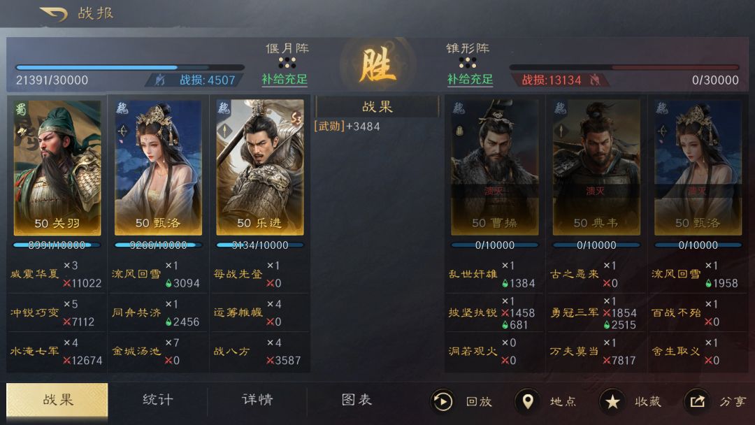 依靠乐进【每战先登】对前排武将的额外加成效果,可提高关羽的伤害和先攻属性,在依靠自身的高先攻一速挂上【战八方】的畏惧,保障关羽【威震华夏】的启动,关羽带上【冲锐巧变】补足伤害的同时,让【水淹七军】跳过准备回合直接释放,打出伤害和群体控制,从而达到胜利。