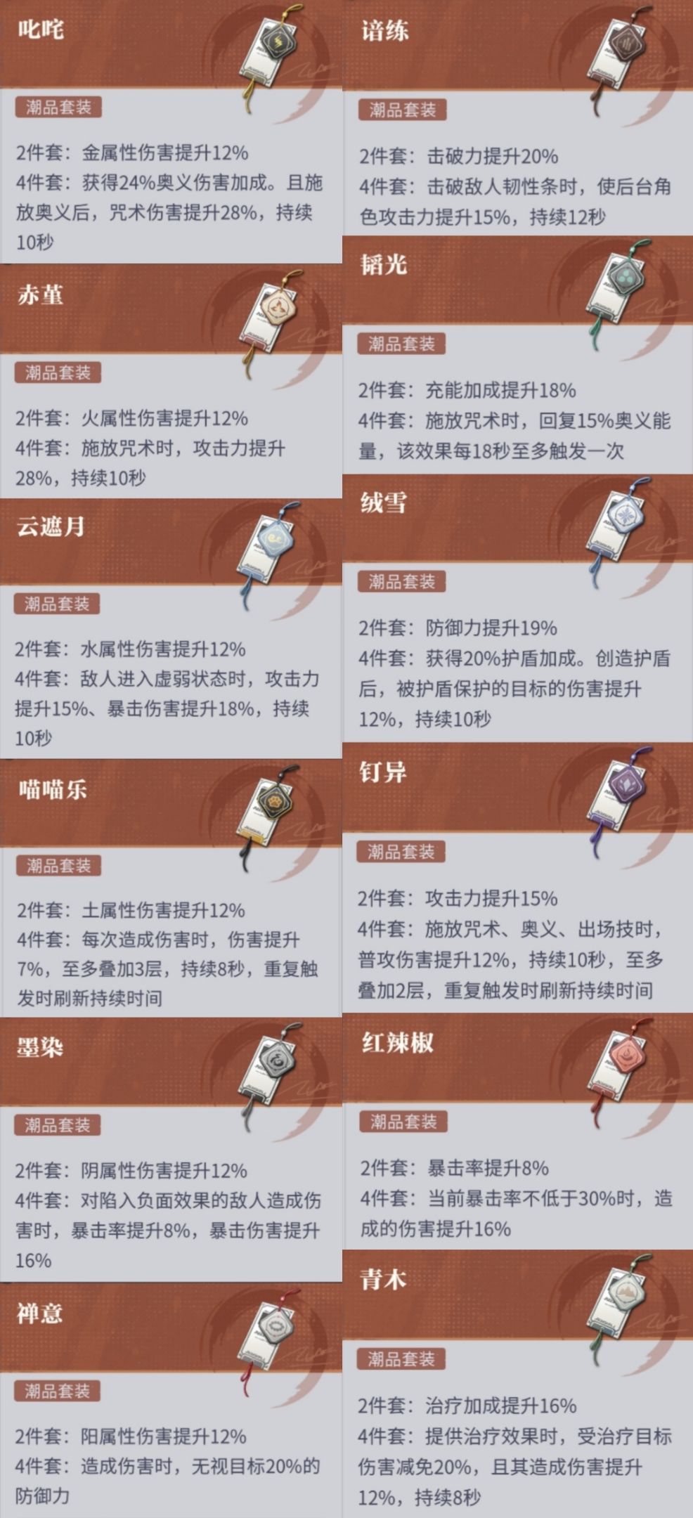 具体效果放上图了,就不细究了。简单说一下:正常搭配的话破韧职业带击破套(谙练),辅助职业带充能套(韬光),输出职业带对应属性的属性套或者攻击套暴击套。但是因为角色的功能不同,所以下面就详细来说。(注:无单属性加成是指该角色不需要吃攻击力以外的属性来增加效果)