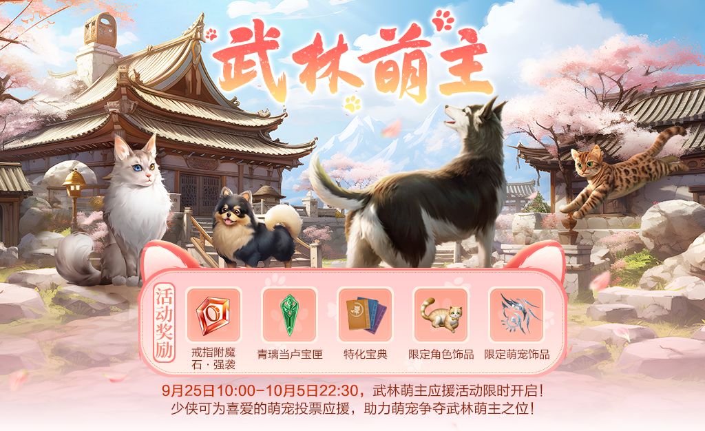 活动内容:武林萌主应援活动限时开启!少侠可为喜爱的萌宠投票应援,为喜爱的萌主增加选票,同时自己也将获得"陶泥爪印/萌宠毛毡"可在集市兑换高级兵魄、毛绒锦囊等珍稀奖励,累积为喜爱萌宠打榜,达到指定积分可得限定外观、限定萌宠饰品等奖励!初赛期间时间内本服排名前20的萌宠,将进入后续决赛阶段,展示武林萌主英姿!其饲主及打榜少侠将机会获得稀有外观、限定称号、戒指附魔石·强袭等丰厚好礼。