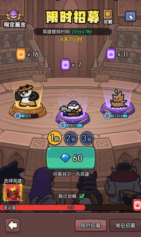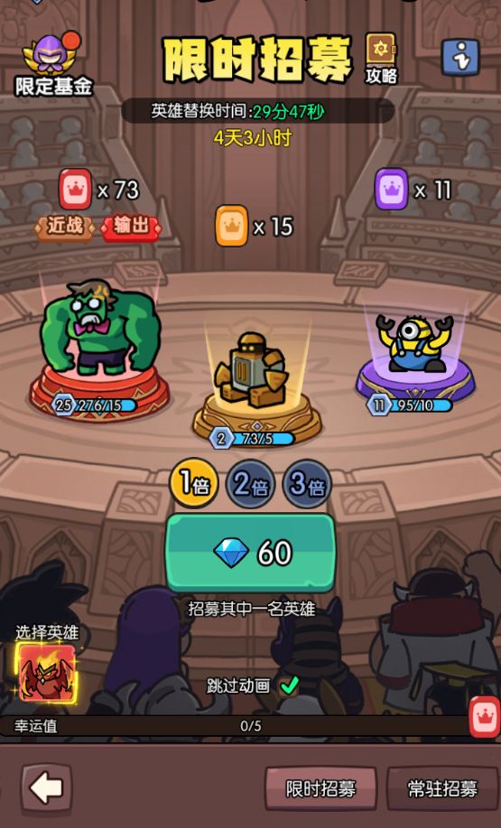 进入活动后可以看到除了招募时的背景有所变化,招募机制也与常驻的招募不一样。首先,限时招募是全程使用钻石进行招募的,招募前勾选心仪的保底:同时,招募池里的神话级英雄也是只会出现当期活动固定的三个英雄:其次,由于钻石的消耗增加了,相应的保底次数也减少到了五次即保底,这样一来,获得强力英雄或喜爱的英雄就很简单了