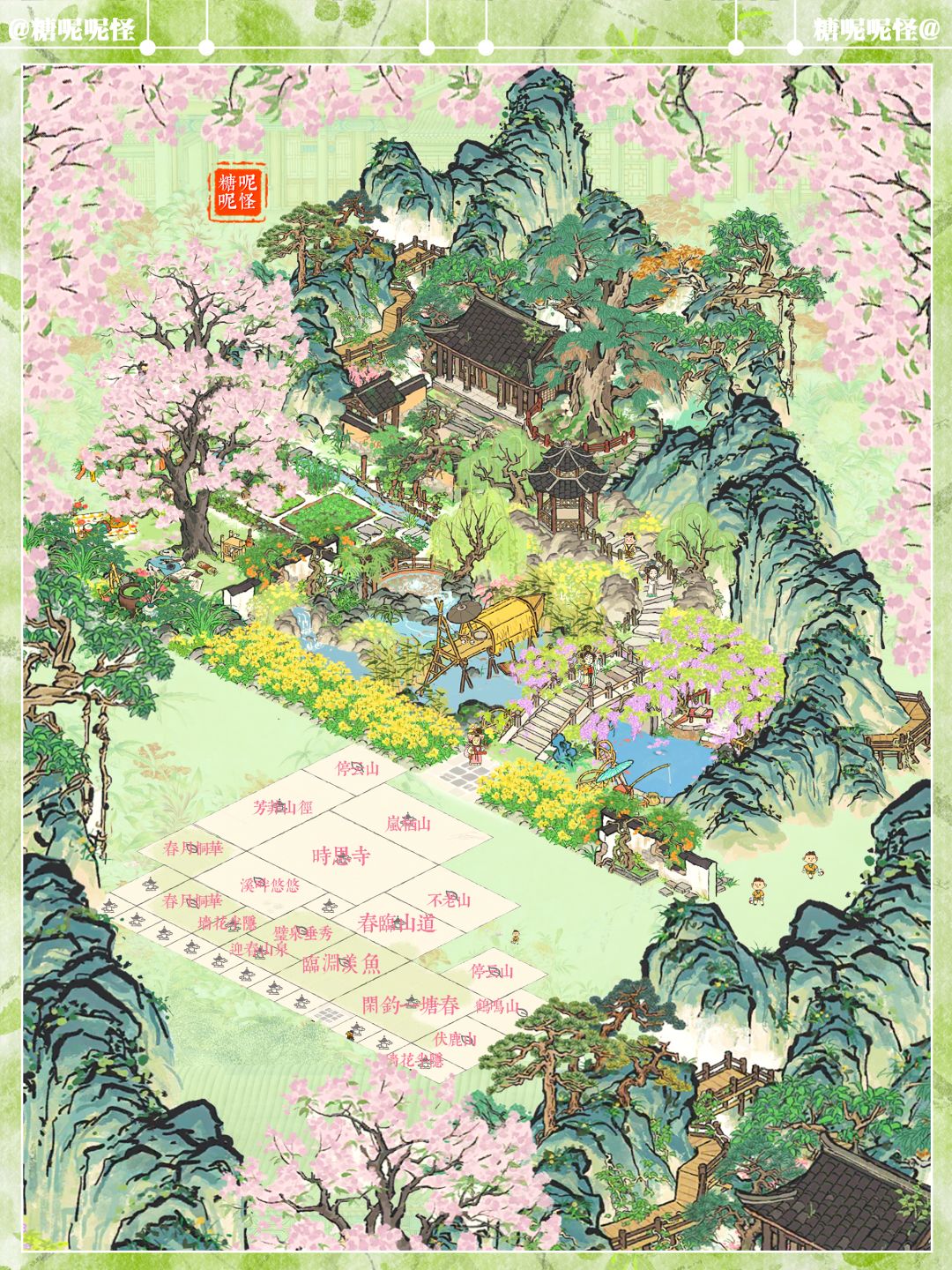 建筑:时思寺|岚栖山|芳菲山径|春临山道|闲钓一塘春|临渊羡鱼|停云山|鹤鸣山|伏鹿山|璧泉垂秀|春月桐华|迎春山泉|墙花半隐