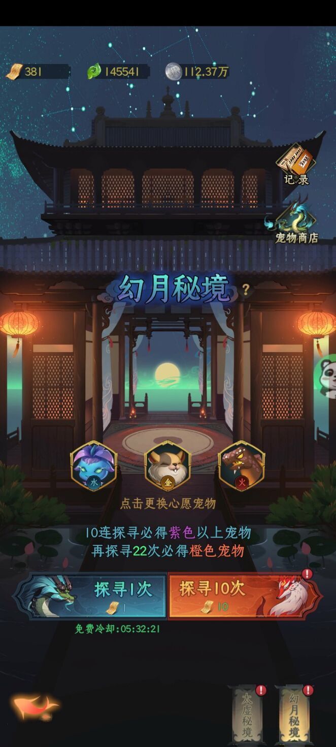 (1)幻月秘境是比较前期的秘境,一般出的是仙兽和圣兽,比较小概率会探寻到神兽,并且心愿宠物可以选择三个不同属性的圣兽,选择好,会提高概率先获得所选的心愿宠物,已经获得后就没办法再重新选择了,所以这边要留意所选的宠物属性是否你当前比较需要的
