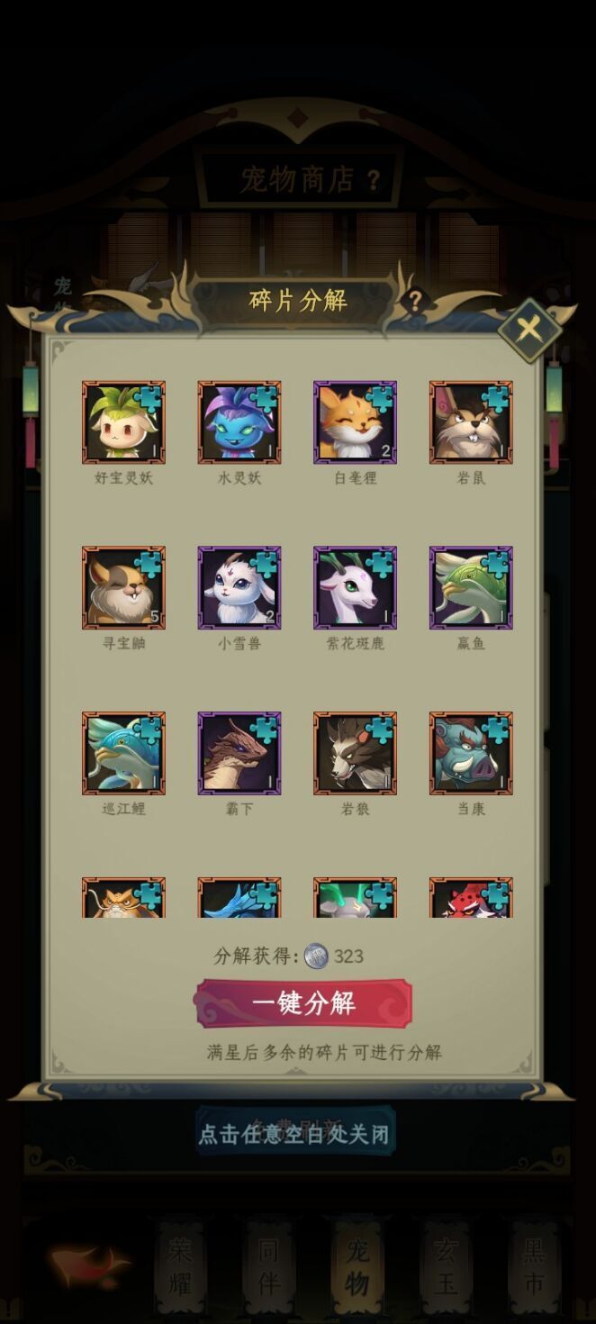 (4)宠物商店主要为购买碎片以及升级材料,当然后期升级满宠物后可以在宠物商店分解已经升级满宠物的宠物碎片,换进积分币,兑换积分商店的东西,这边小编提醒大家,升级满的可以优先选择宠物的升级道具以及自选碎片用来升星,如果宠物比较少的可以选择随机碎片的呢,当然这个就需要长时间的积累了