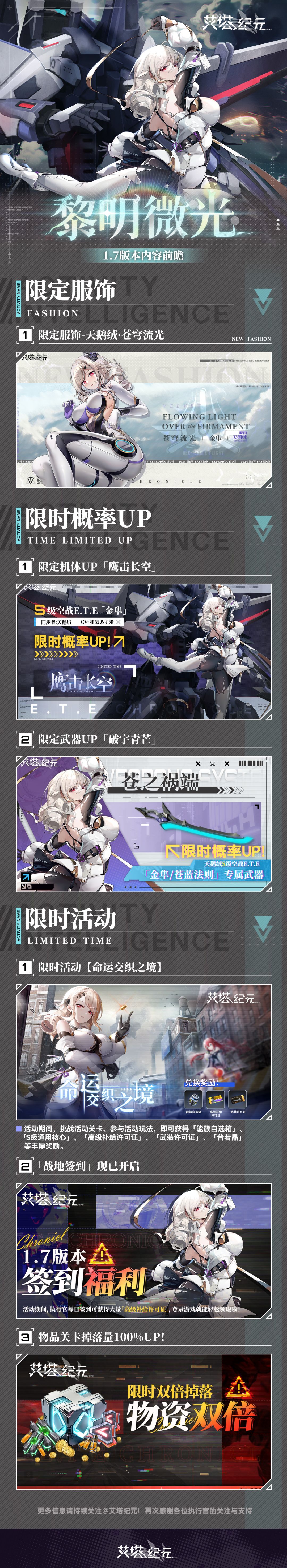 1.7版本「黎明微光」将于9月26日更新维护后上线!新的S级艾塔「金隼·苍蓝法则」上线,可通过限时机体补给活动【鹰击长空】获得。有着独特战场压制能力的艾塔,更进一步增加了强力的能量反制能力,使其在各类高烈度战斗中均将发挥出极为关键的作用。