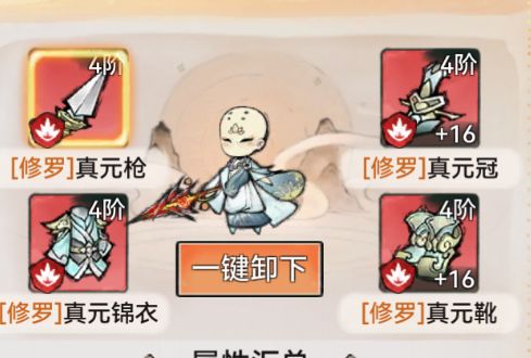 装备搭配:修罗套装+道兵灾星。武器最好是使用枪,增加暴击率,这样我们的法宝可以放心的精炼爆伤,修罗套装的副属性一定要有防御的百分比,防御高于一切,防御越高伤害就越高。