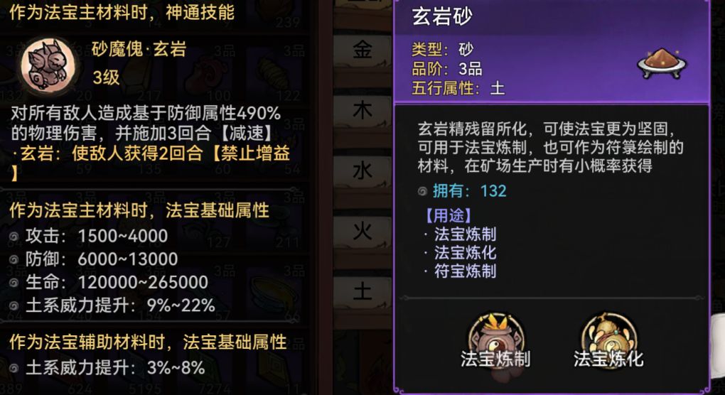 本命法宝的话我们就带覆天印然后一定要带砂的,然后以我们的玄岩砂为主法宝,伤害高并且提供减速和禁止增益,炼化也是搞爆伤,暴击率在60%以上就行了。