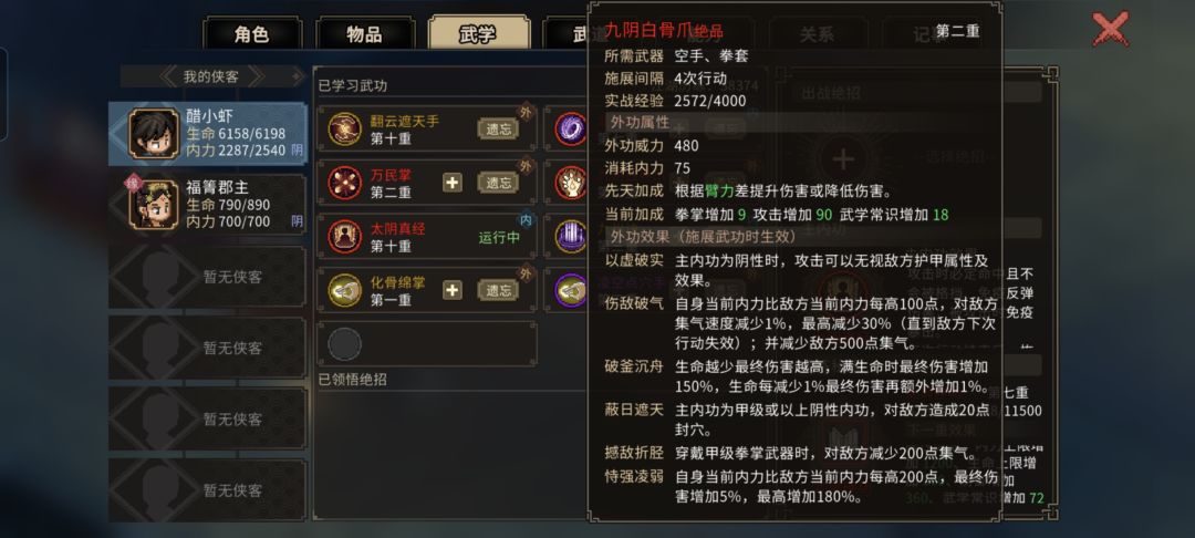 再说招式合成,招式的攻击范围方式,先天加成(角色臂力,敏捷,体力等对伤害的影响)受主功法影响。副功法的特效强加在主功法上。