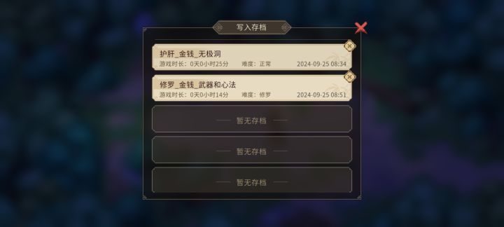 Save14(存档15)是正常难度+2百万贯+部分特征+无极洞心法(自己依据自身体验决定要不要使用)
