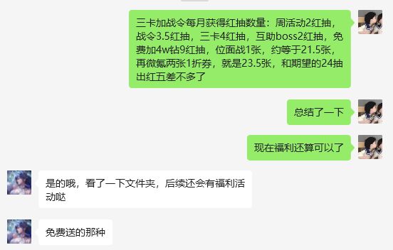 三卡加战令每月获得红抽数量:周活动2红抽,战令3.5红抽,三卡4红抽,互助boss2红抽,免费加4w钻9红抽,位面战1张,约等于21.5张,再微氪两张1折券,就是23.5张,和期望的24抽出红五差不多了。氪金建议,在此基础上,每月再三星红陈拉开和三卡加战令的差距