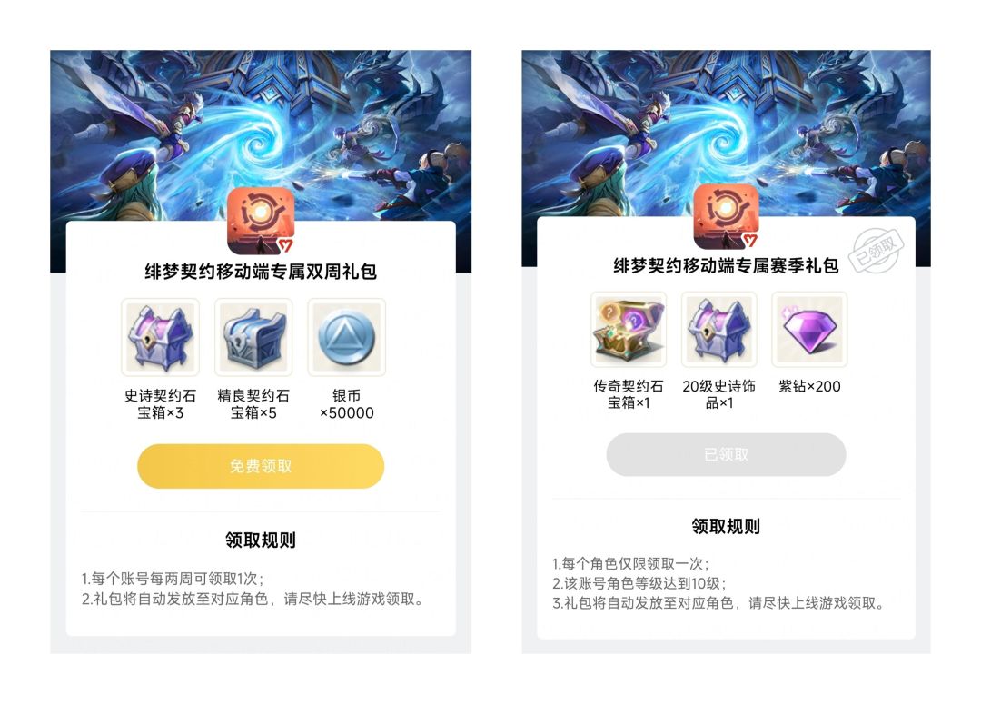 登录战盟APP——点击右下角【我】——点击“我的应用”中的【礼包】——选择【绯梦契约移动端专属双周礼包】或【绯梦契约移动端专属赛季礼包】——点击【免费领取】——选择账号下任意一个角色即可领取,奖励将以邮件形式发送至冒险者邮箱内。