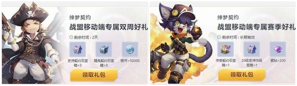 除此之外,还可以点击游戏内【福利】图标——点击【关注战盟】——点击【前往战盟】——进入战盟网页版,找到“礼包中心”——点击【绯梦契约】——选择【绯梦契约双周礼包】或【绯梦契约赛季礼包】——点击【免费领取】——选择账号下任意一个角色即可领取,奖励将以邮件形式发送至冒险者邮箱内。