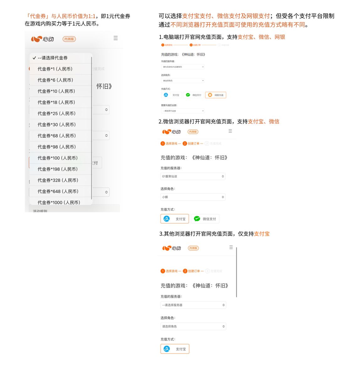 1)官网充值页面地址:心动神仙道怀旧官网充值