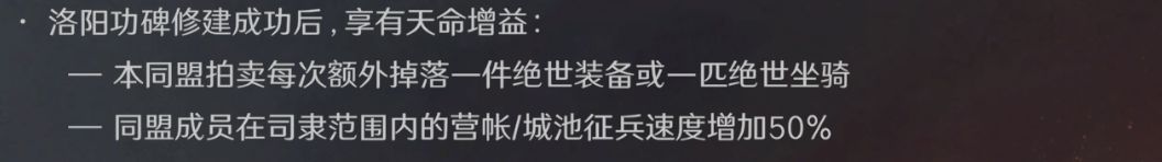 洛阳成功修建功碑后,享有天命增益:同盟拍卖每次额外掉落一件绝世装备和绝世马匹,同盟成员在司隶范围内的营帐、城池征兵速度增加50%,此加成可谓是大大增加了洛阳重要程度。拿下功碑之后不仅可以多获得绝世坐骑和绝世装备,享有更多的同盟拍卖分红,还能增加同盟成员在司隶范围内的征兵速度,使同盟拥有更强的持续作战能力。