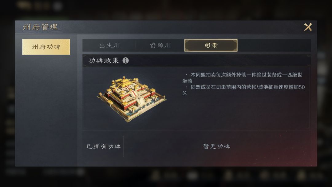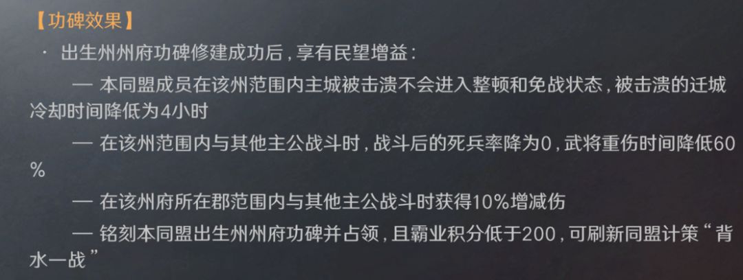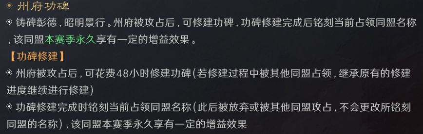 同盟占领州府后会修建一个功碑,出生州、资源州、司隶之中的州府都可以。占领州府后功碑即自动开始修建,48小时可修建完成。但修建期间存在抢夺风险,敌对同盟抢夺成功后,则继承我方同盟的修建时间,铭刻完成过后,敌对同盟无法抢夺该增益,功碑修建完成后铭刻当前占领同盟名称,该同盟在本赛季永久享有一定的增益效果。