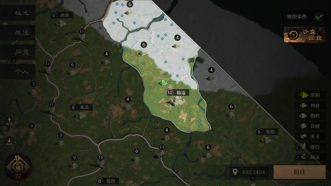 以青州州府临淄举例,郡范围如下图所示,在高亮区域内对战能够同时拥有降低战损和增减伤的加成。