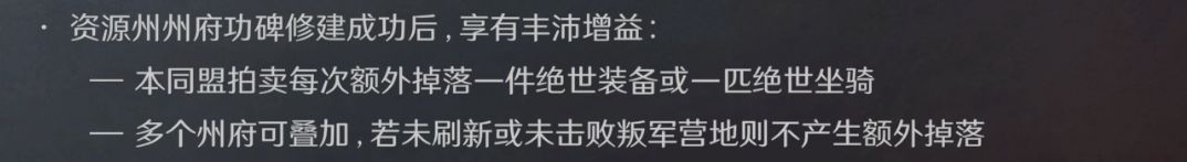 资源州州府修建功碑成功后,享有丰沛增益:本同盟拍卖每次额外掉落一件绝世装备或一匹绝世坐骑,多个州府可叠加,若未刷新或未击败叛军营地则不产生额外掉落。此加成对于有实力角逐资源州州府同盟比较实用,额外的绝世装备和马匹不仅提供给同盟更强的战力,还能增加同盟分红,让盟友团结力更高。