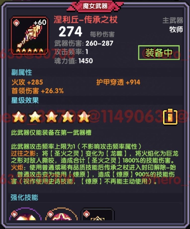 武器4星效果:橙技能【圣火之灵】变化为【龙噬】,造成1800%【圣火之灵】技能伤害