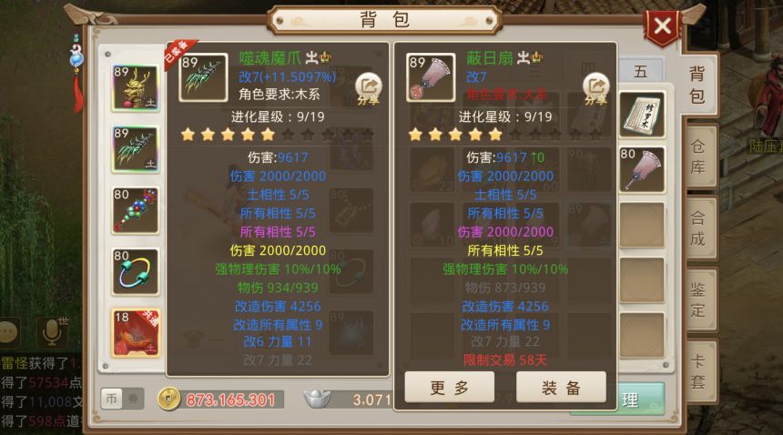 二哈大晴天:道友这2件武器都挺不错,爪子绿出了强物理伤害10%,差5点暗伤就是传说中的完美度100%,扇子也是强物理伤害10%+高暗伤。虽然这2件武器都是力系武器,但其所属的门派却“风马牛不相及”。总之,不论是纯粹爱好收藏武器,还是打算转个门派玩玩,这位道友的2件武器都很厉害。