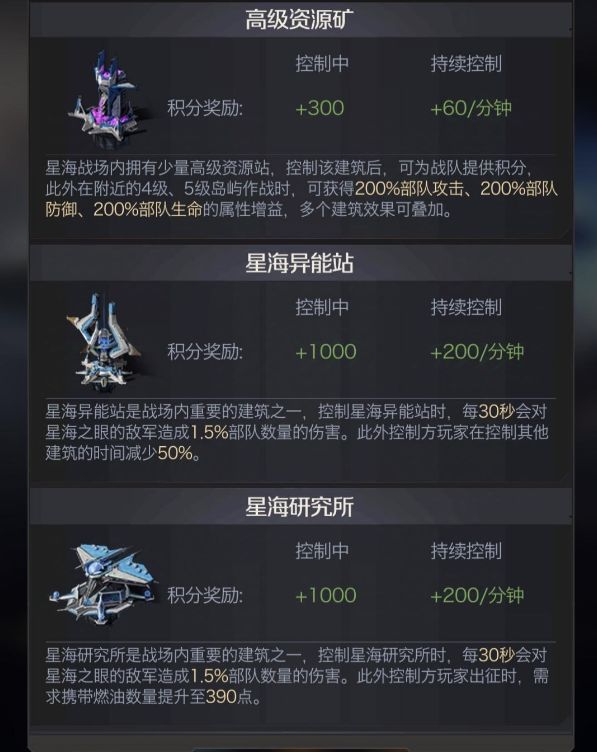 3.建议优先抢占特殊建筑,掌握主动。首先要多控制星海能源站,提升成员燃油恢复速度和战队共享燃油恢复速度,星海能源站多个建筑效果是可叠加的。其次,在4级、5级岛屿作战时,高级资源矿至关重要,控制高级资源矿可获得200%部队攻击、200%部队防御、200%部队生命的属性增益,建议安排好队伍去控制,后期争夺星海之眼的时候,星海前哨站又是必拿建筑了。