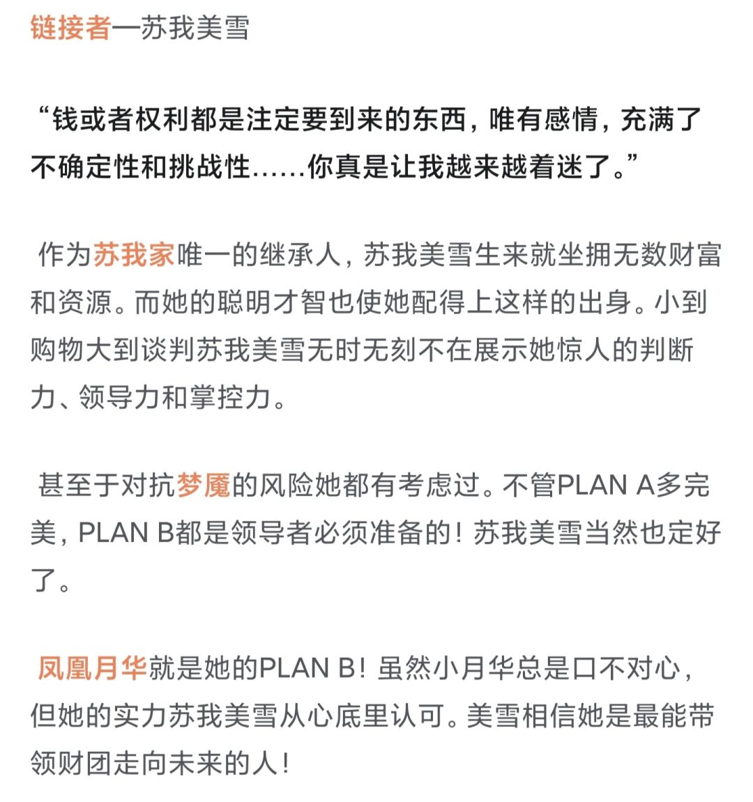与凤凰月华是对手,也是朋友,有着傲娇一般的友谊。在美雪遇到危险时凤凰月华也是她后盾,为她在背后准备plan B。