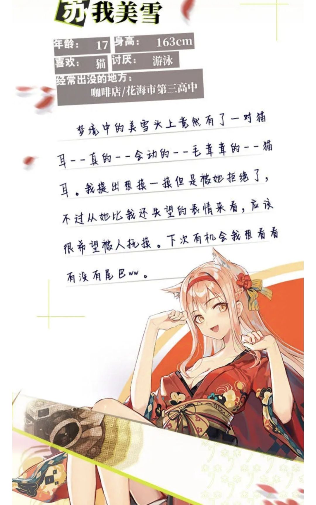 美雪可爱喵,设计中的猫猫元素我很喜欢,想摸摸猫耳,软乎乎的。