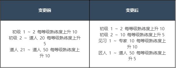 随着生活等级上升,熟练度上升构造也做了变更- 从道人21等级到道人50等级,每个等级熟练度会各上升10的区间会移动到见习 1 ~ 专家 10等级- 因生活等级的熟练度上升值之总和为道人50等级为基准的800,和原先相同