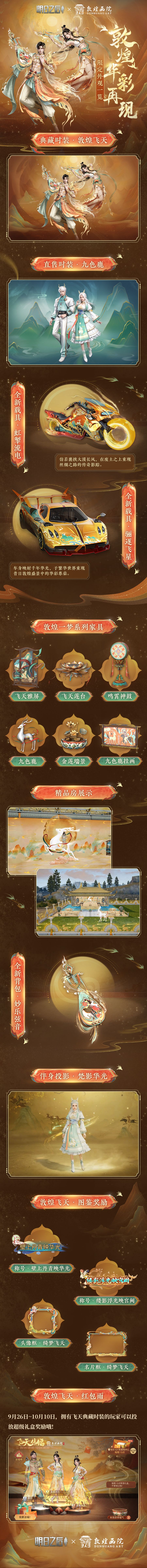【主题道具】全新载具[虹掣流电]和[骊逐飞星]上线!流光溢彩的车身,仿佛能瞥见古老神韵流淌。背上全新背包[妙乐弦音],化身敦煌伎乐轻扫琴弦,聆听如珠玉落盘般的清脆悠扬。佩戴伴身投影[梵影华光],感受圣洁的九色鹿光辉环绕身旁。