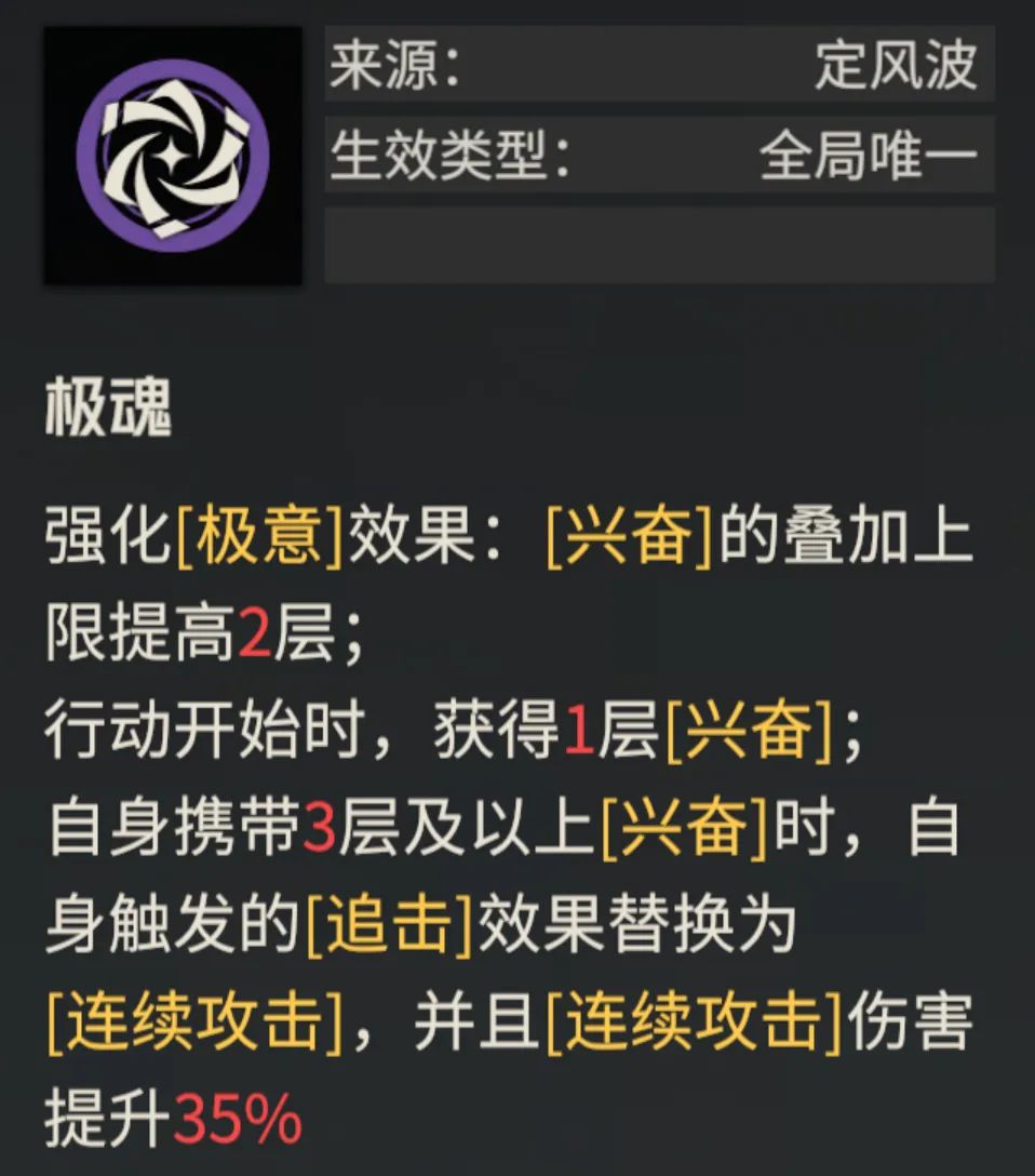 接着第二个效果是提升“兴奋”的层数上限和改追击为连击的效果,那么因为刚刚我们已经测试了,敌人反击时的完全闪避是无法触发回复AP效果的,因此这个追击改连击后造成的敌人无法反击的现象也就无妨了......