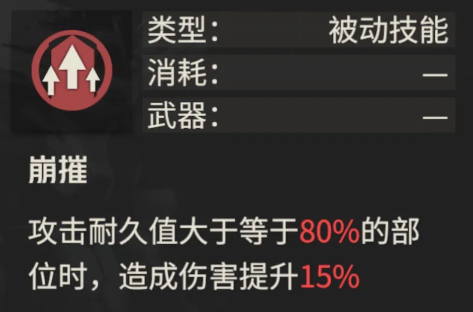 最后则是这个80%部位血量以上,则可以增伤15%的效果,经过实测如果虹用的则崩山,则假设第一次攻击将敌人的血量恰好打下了80%后,第二次崩山的攻击则无法吃到这个增伤效果。