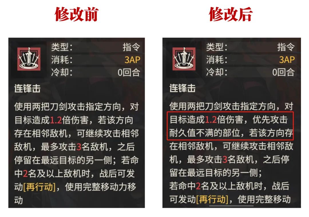 接着第三个改动则是对很飘逸的来回位移输出技能【连锋击】,新增了一个优先攻击耐久值不满部位的规则,这个加强并不是奥菲利亚此次改动中的核心,因为这个技能的泛用性目前暂时存疑,不过有了此增强后,在我们需要使用这个技能的时候也能更高的触发再动等效果。