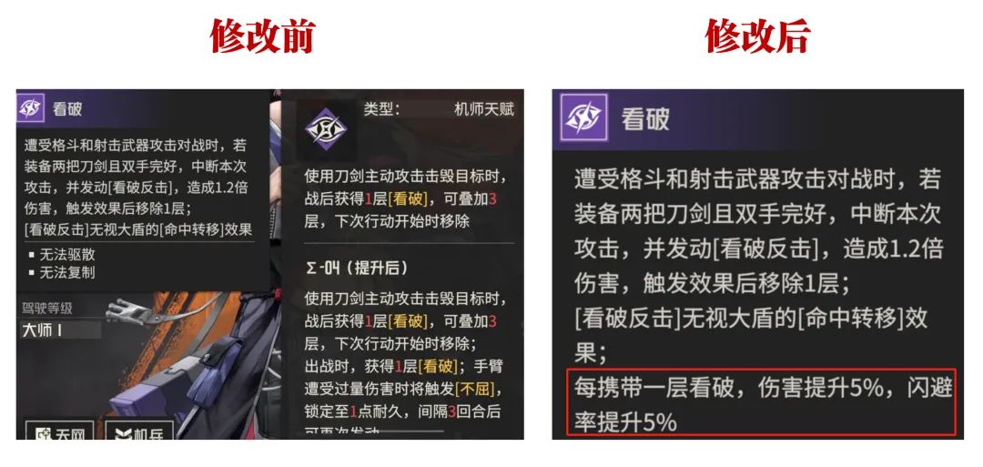 接着第二个改动则是针对奥菲利亚天赋中【看破】这个效果做出的改动,其中目前是新增了每层看破可以提升5%伤害和闪避率的效果,相当于最高就是每回合15%伤害和15%闪避率的加成,那么考虑到【看破】的积累是需要通过击破敌人部位后才能触发的,所以其也又一次证明了这位角色官方在设计她时,就是按照更多清杂的思路来做的,而这个作用也符合于格斗职业的本职效果。