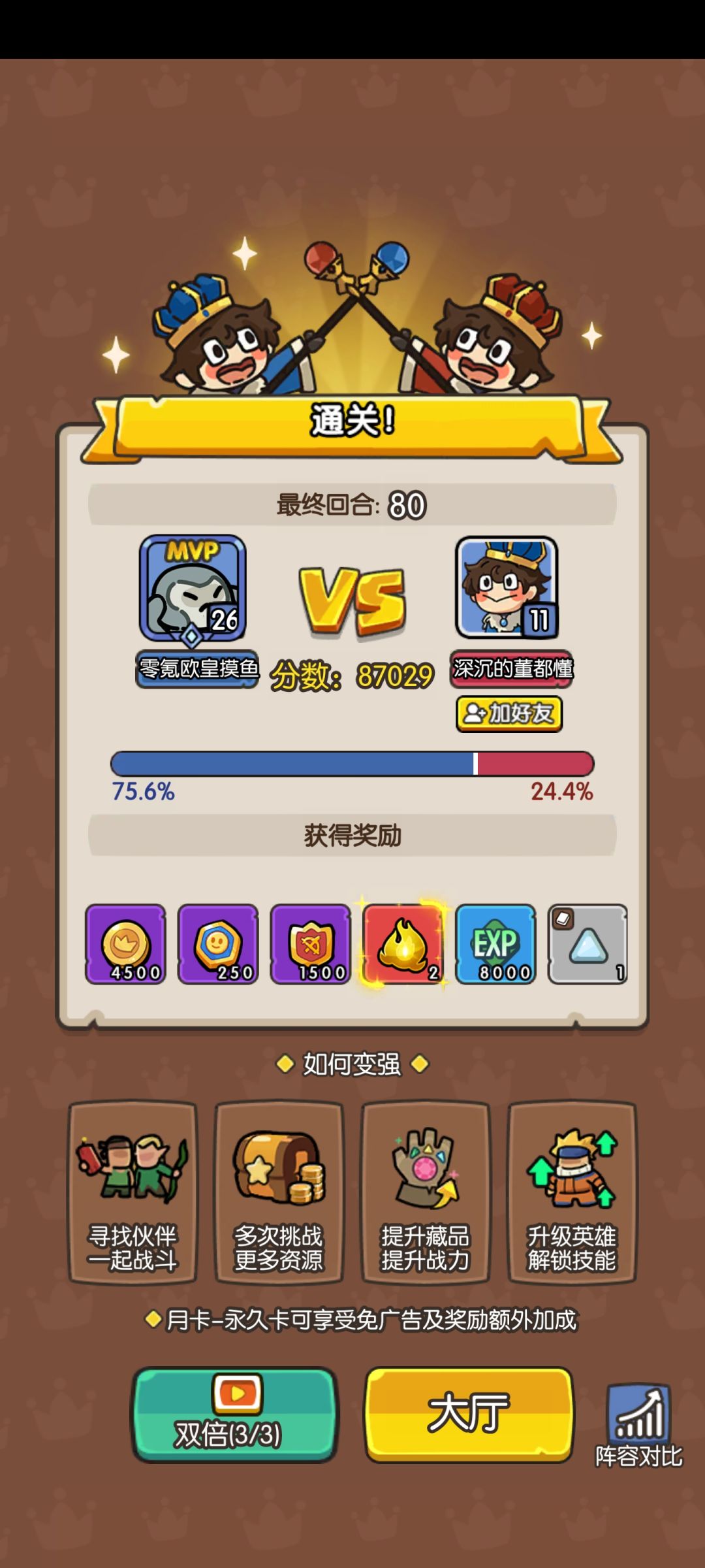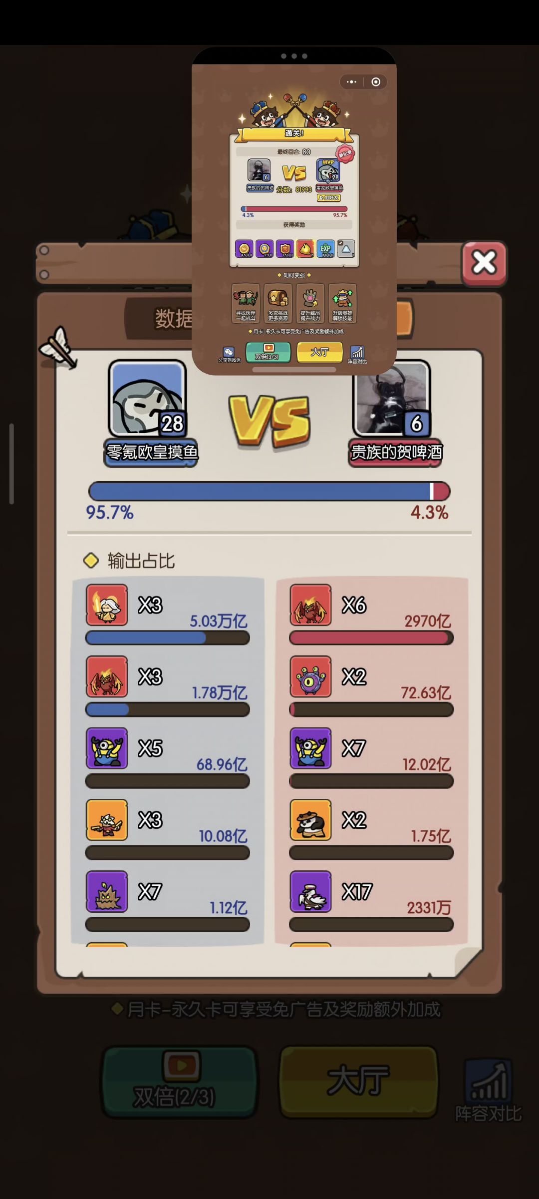 接下来就是困难干货,首先开局不要召唤英雄和国王,怪物满80会除非任务奖励,所以我们要等到怪物数量为80再去召唤国王。然后接下来就是一个细节,可用可不用,第七关的时候右边会出现【狩猎】图标要秒点,到了第十关的时候BOSS不要先打死,等下一个【狩猎】BOSS出来再打,会额外给三个【祈愿币】,祈愿币有一定的数量就去召唤史诗英雄,有【凤凰】主要的材料【鸽子】,有些不是自己用的史诗英雄三个可以合成,运气好的话会出【明剑】的主要材料【神枪手】,前50关每10关会奖励一次英雄选择,第10关拿紫随机,20到40关有鸽子拿鸽子,第50关会给【传说】英雄,大概率会出现【名剑】的材料【神枪手】必拿!!!这样大概率差不多就拥有俩个【明剑】,按照我之前说的强化技能,70关之前基本没什么压力,按照我发的【位置图】作为参考即可,70关以后在火力不足的情况下,需要手动移动【罚站的明剑】,也就是不停的跟【小黄人】置换位置,很轻松就过了,有视频