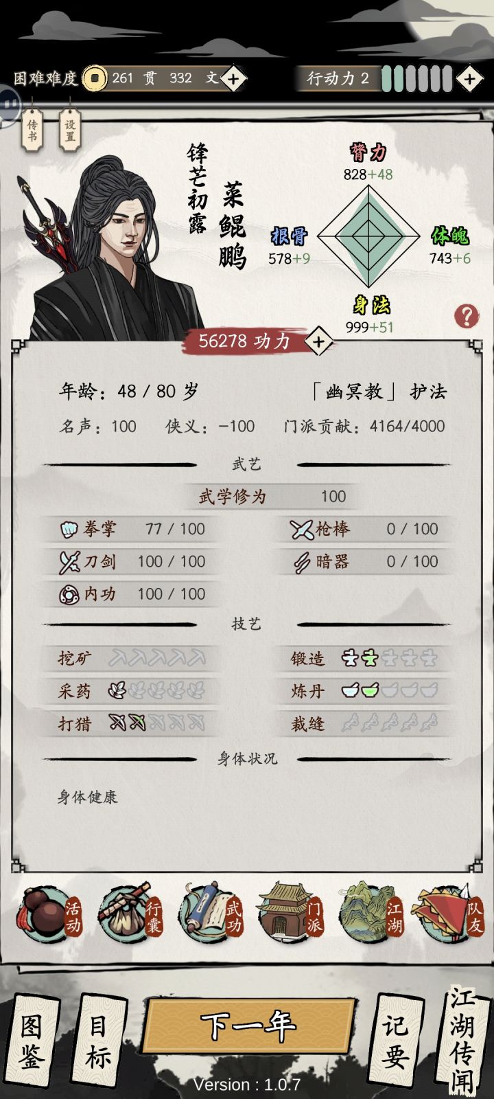 加点平均加,18岁学功法,咱们主打一个不看广告,猛猛偷学技能,偶尔没偷到也无所谓的,反正前期偷个三四本,然后就修炼升级功法,战力够了直接招能打的队友,8000战力就可以开始找队友然后抢劫,先抢劫那些门派长老的,普遍战力一万多,后面战力上去了直接找更牛逼的队友,然后洗劫所有门派,自家的也抢。