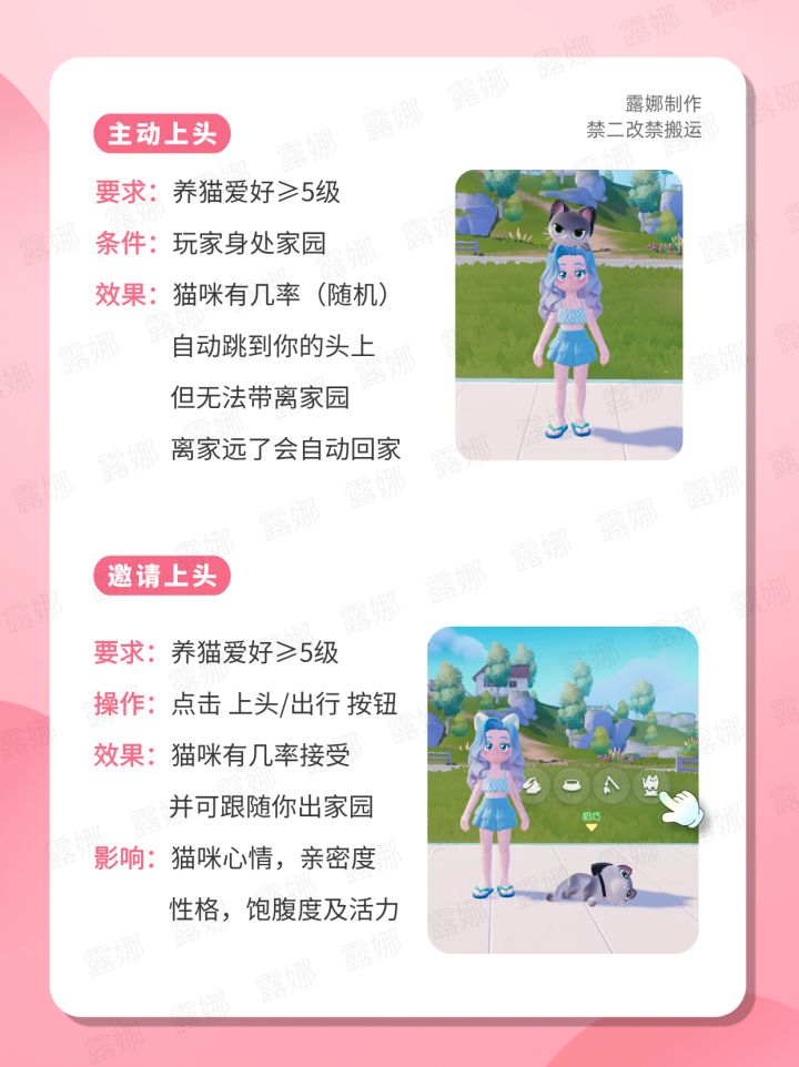 效果:猫咪有几率(随机)自动跳到你的头上,但无法带离家园,离家远了会自动回家