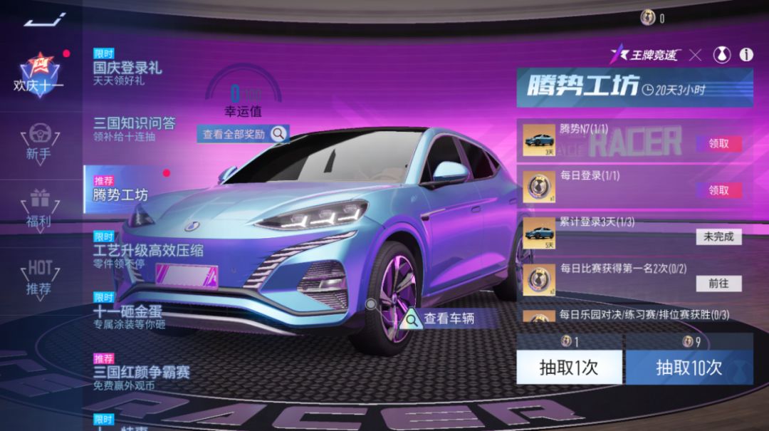 安全豪华,智电融合,10月1日~10月24日活动期间,各位车手可以完成每日工坊任务获得“腾势精品币”,抽取腾势工坊内奖励。每抽取1次幸运值加1,当幸运值达到100时,必得大奖-永久车辆。当幸运值达到100且已经拥有车辆时,则必得奖励-车辆蓝图。当抽取到永久车辆时,幸运值清空;当已经拥有永久车辆且再抽取到蓝图时,幸运值清空(本期工坊大奖:永久 腾势N7、腾势N7 蓝图)