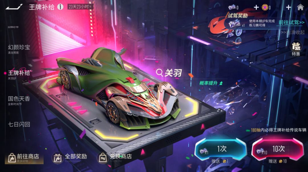 王牌补给将开启全新活动!传说车辆『关羽』限时概率提升66%!『全新大招-过五关斩六将』进入冲锋姿态,极速提升6秒,大招期间每次超越其他车辆时获得大招极速增加、时间延长等效果。