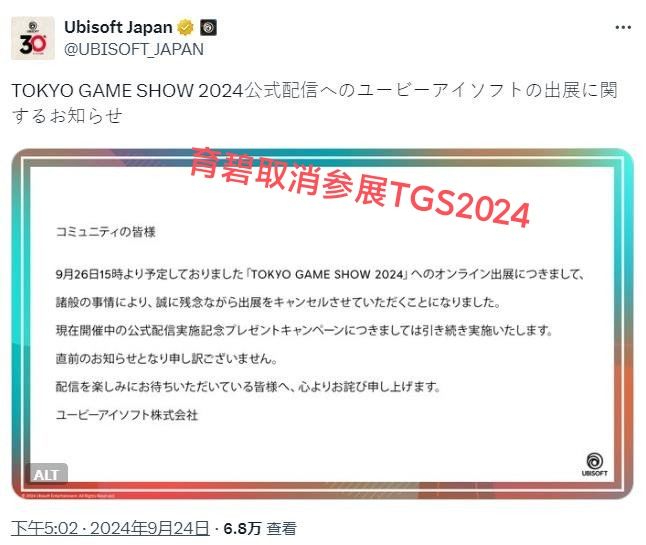 9/24育碧还宣布取消参加TGS2024,原因没有明确说明,现在看来估计是《信条刺客 影》延期导致的