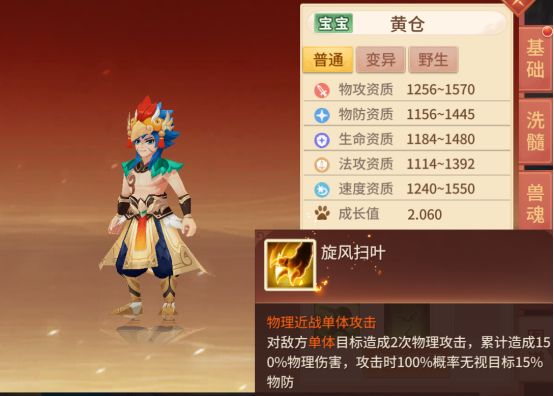 无视物防 - 【旋风扫叶】黄仓,作为69等级前唯一带有天赋主动技能的物攻宠物,2次单体攻击+无视防御,外加物理近战可以吸血,注定黄仓在69等级前有一战之力!