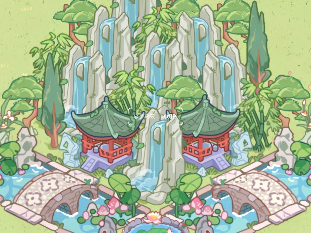 立体对称布局 ,高山、松树、流水、亭子、池塘,打造一个山水景观。