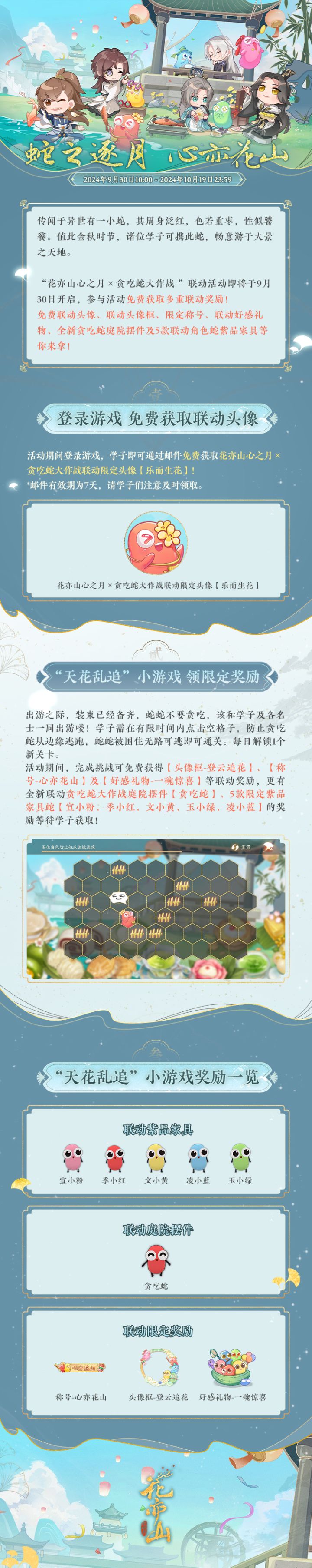 “花亦山心之月×贪吃蛇大作战 ”联动活动即将于9月30日开启,参与活动免费获取多重联动奖励!