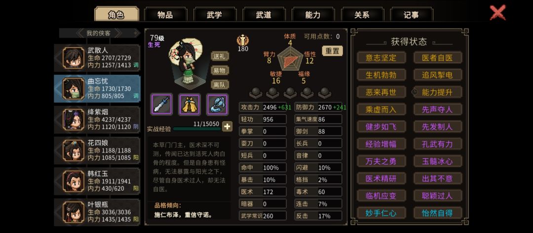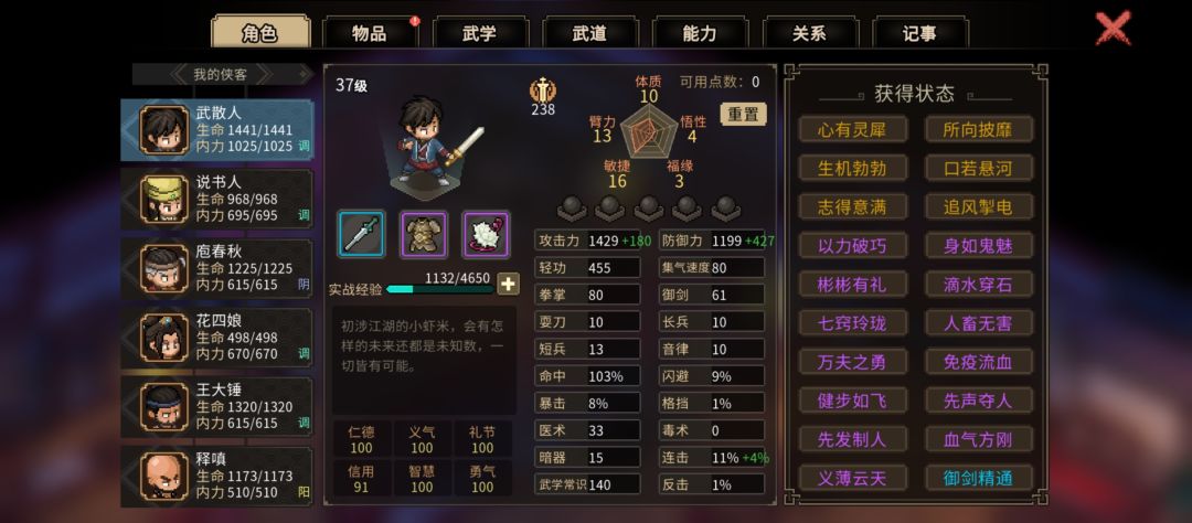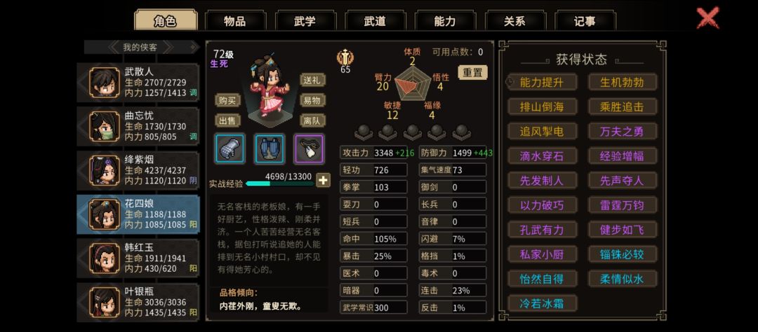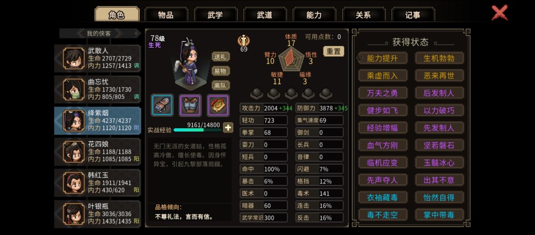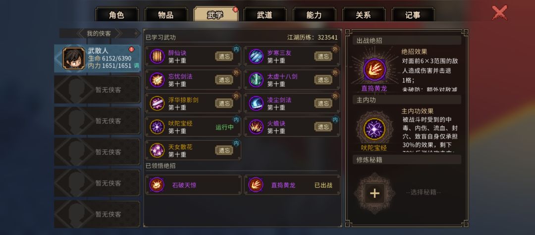 先有大目标,才可能玩的舒服些。由于学武学格子有限且遗忘也会退属性修为,就不太推荐玩“草木皆兵”的全类型武学,一般是玩一到两个专精武学比较好,其中拳武学兼容其他武器,反之则不行(没草木皆兵的话)。