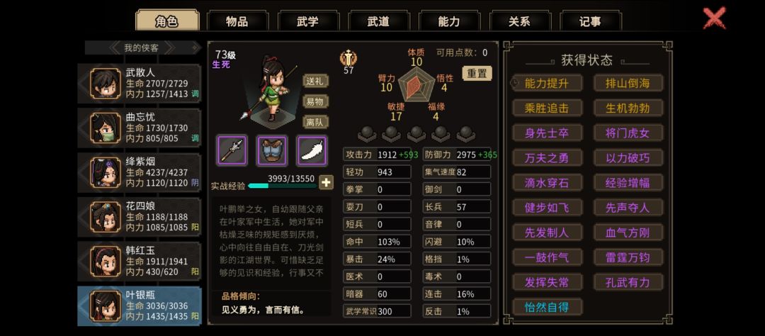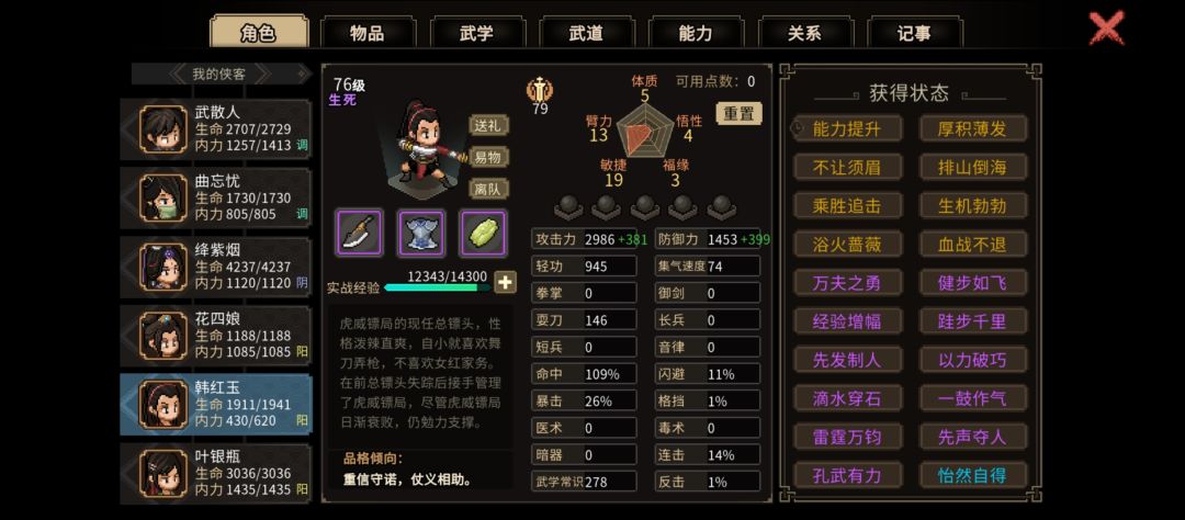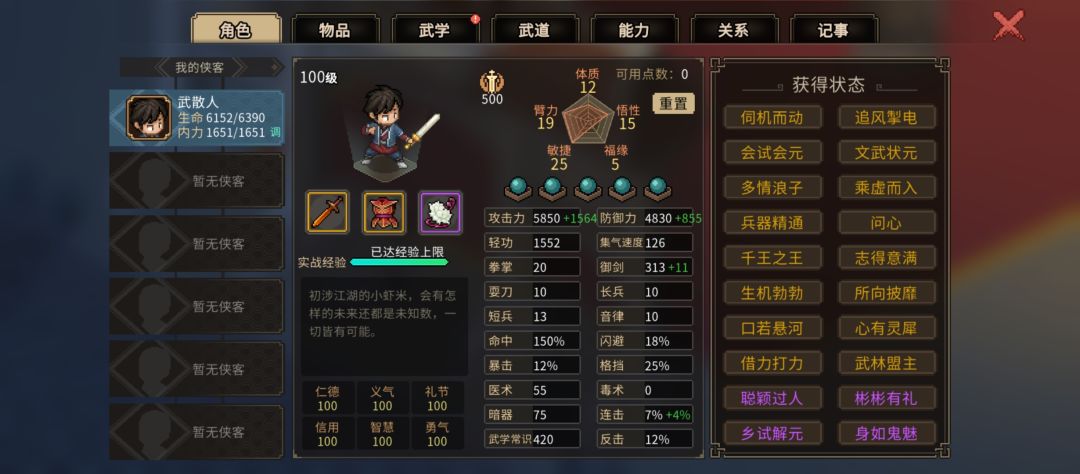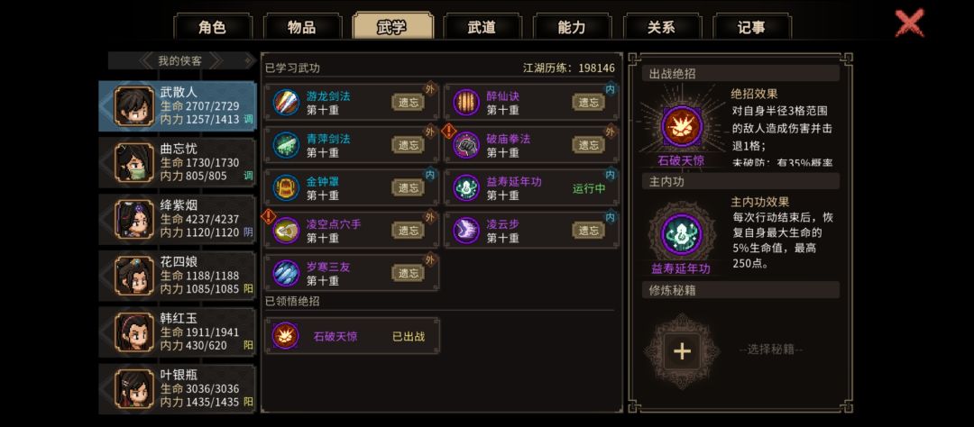 武功方面,岁寒三友容易获得,其他需要提升能力解锁