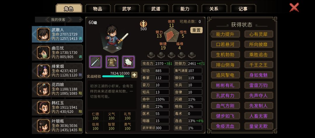 10点属性会解锁特性,我这里是开局10臂力10体质0悟性,剩下能点的全给到敏捷。比较推荐的天赋是心有灵犀、身如鬼魅,其他看个人喜好,建议能给初始属性的都点点,不过悟性可以不点,0悟性才能拿石破天惊。
