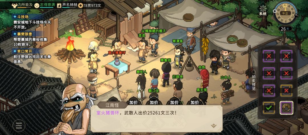 开局比较简单的玩法是,十里坡剧情(200文)或者无名村庄卖东西凑钱,大概300这样,在茶摊买酒给落魄江湖人送礼到知己(也能切磋加好感),别直接给满好感会强制进剧情,知己以上学机关术(学艺),就能去村庄破解村长家旁边箱子(要战斗砍挡路的木头)要宝藏图,这样开局就能有一贯左右的钱,直接坐机关马去城镇赌场sl赌钱,还没能去城镇的期间就可以先做无名村庄部分任务,记得500文留底。